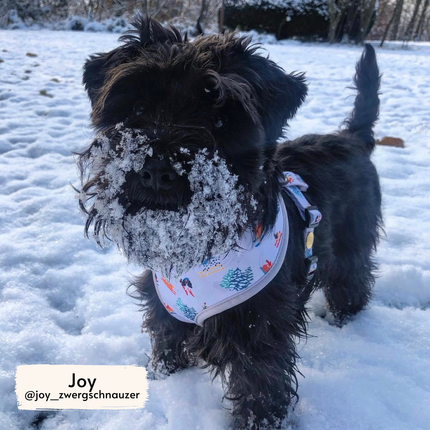 • Jacky, a Geneva-based schnauzer, wearing Pata Paw's Ski Wonderland dog harness