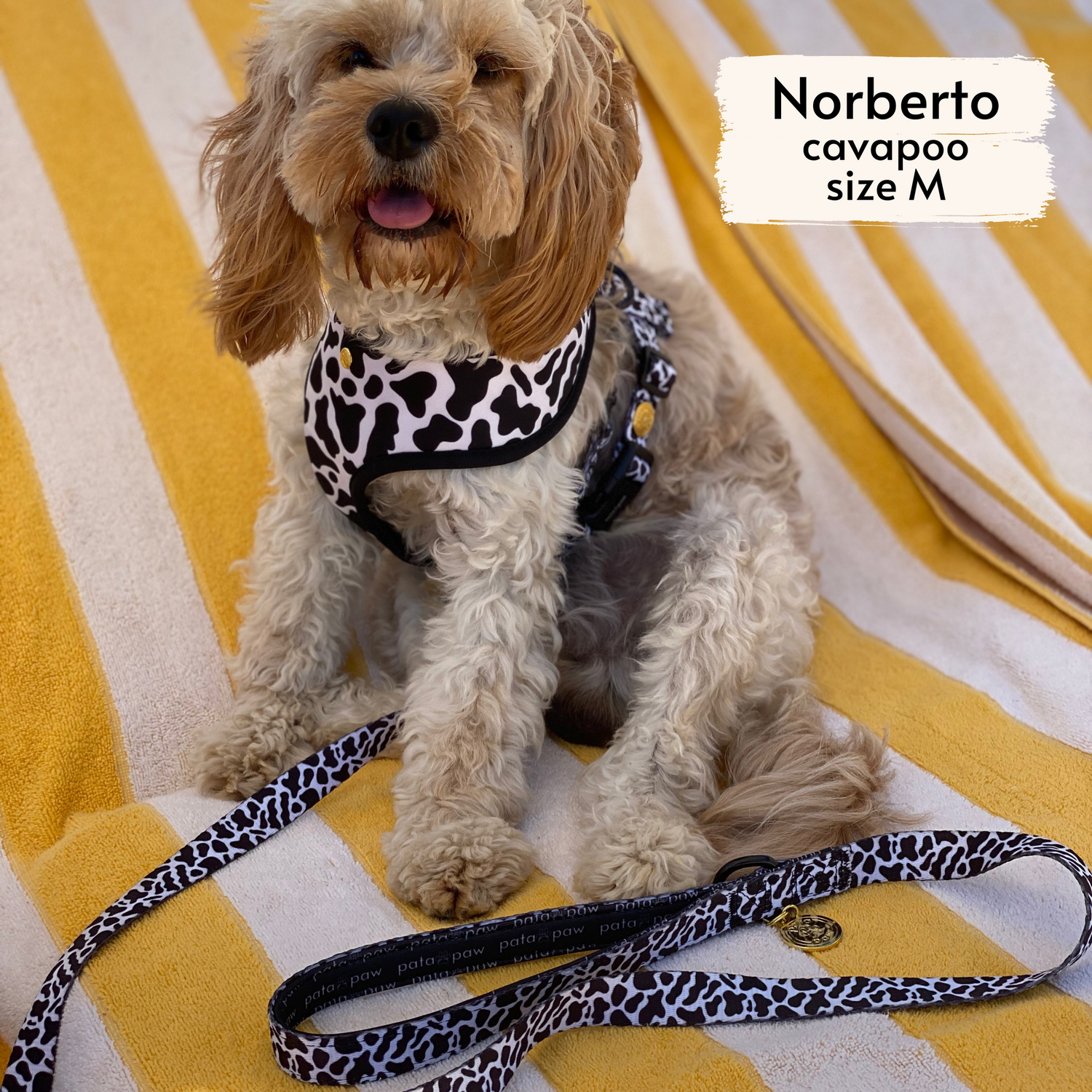 • pata paw moo set: reversible harness, leash, collar, and poop bag holder
