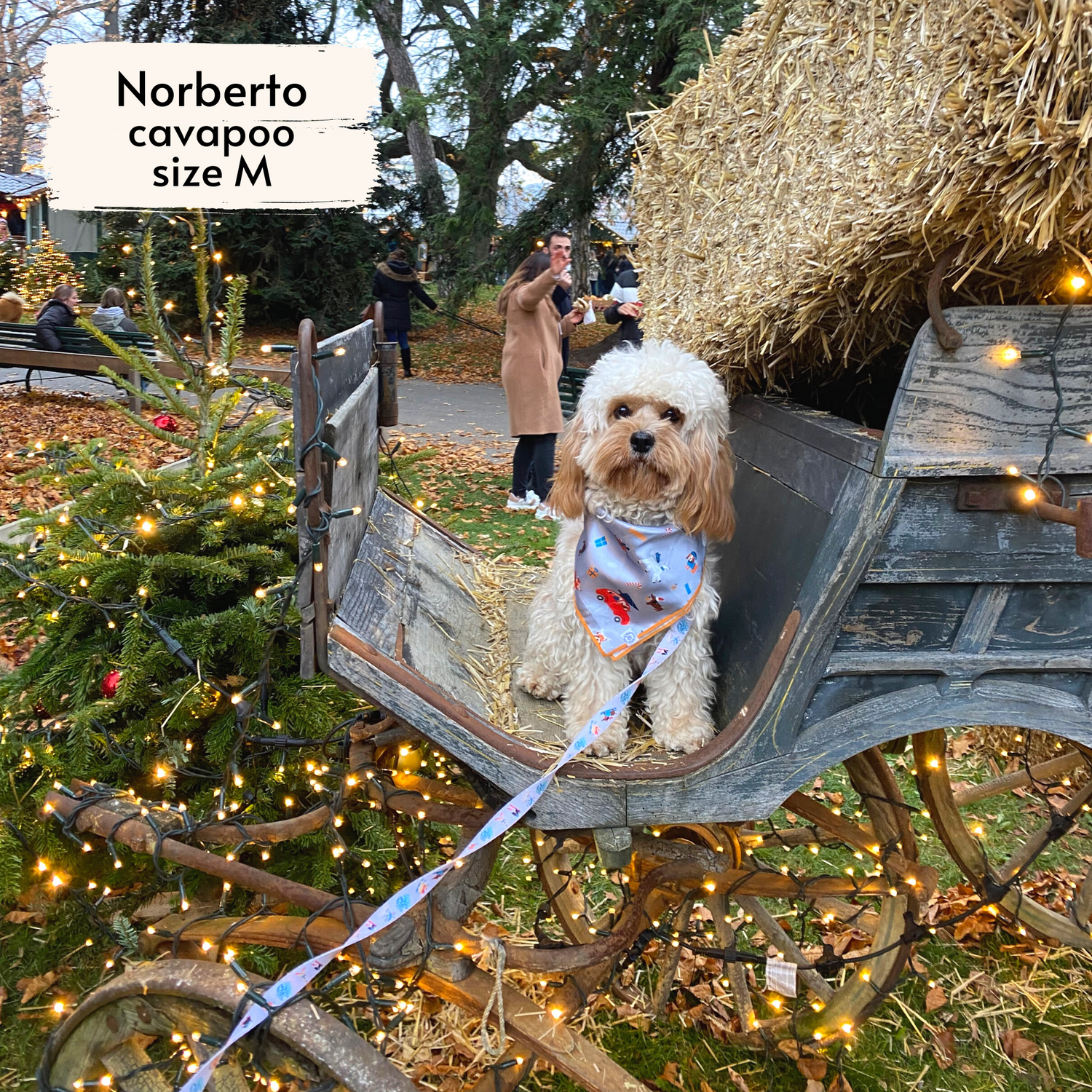 • merry woofmas bandana as seen on a medium-sized dog, Norberto, a cavapoo