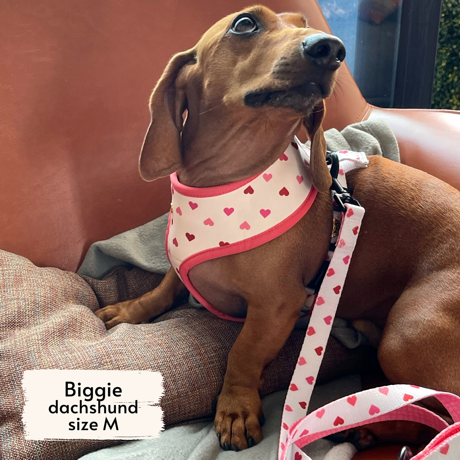 • Pata Paw blush hearts reversible harness as seen in a medium-sized dog.