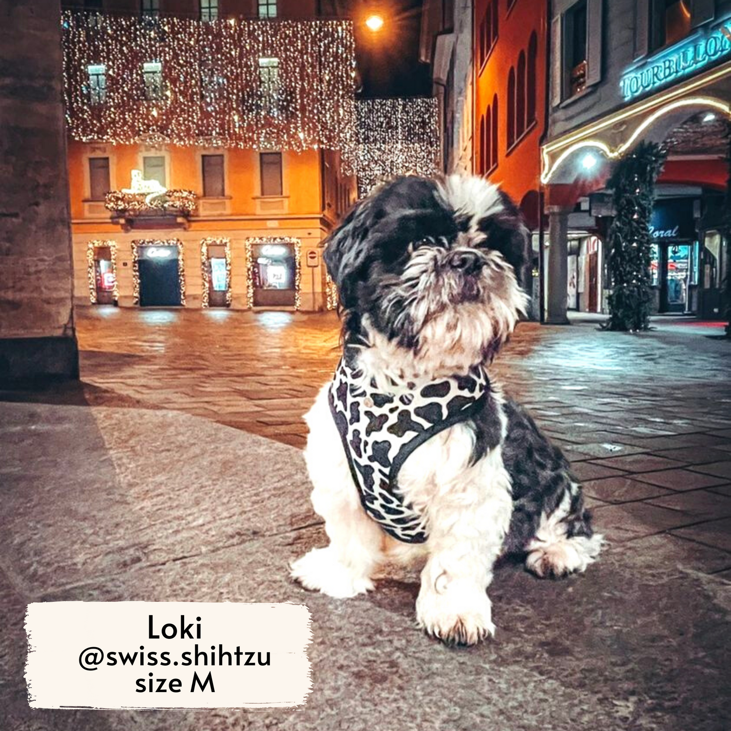 • Pata Paw moo harness as seen on a small dog, Koda, a shih tzu.