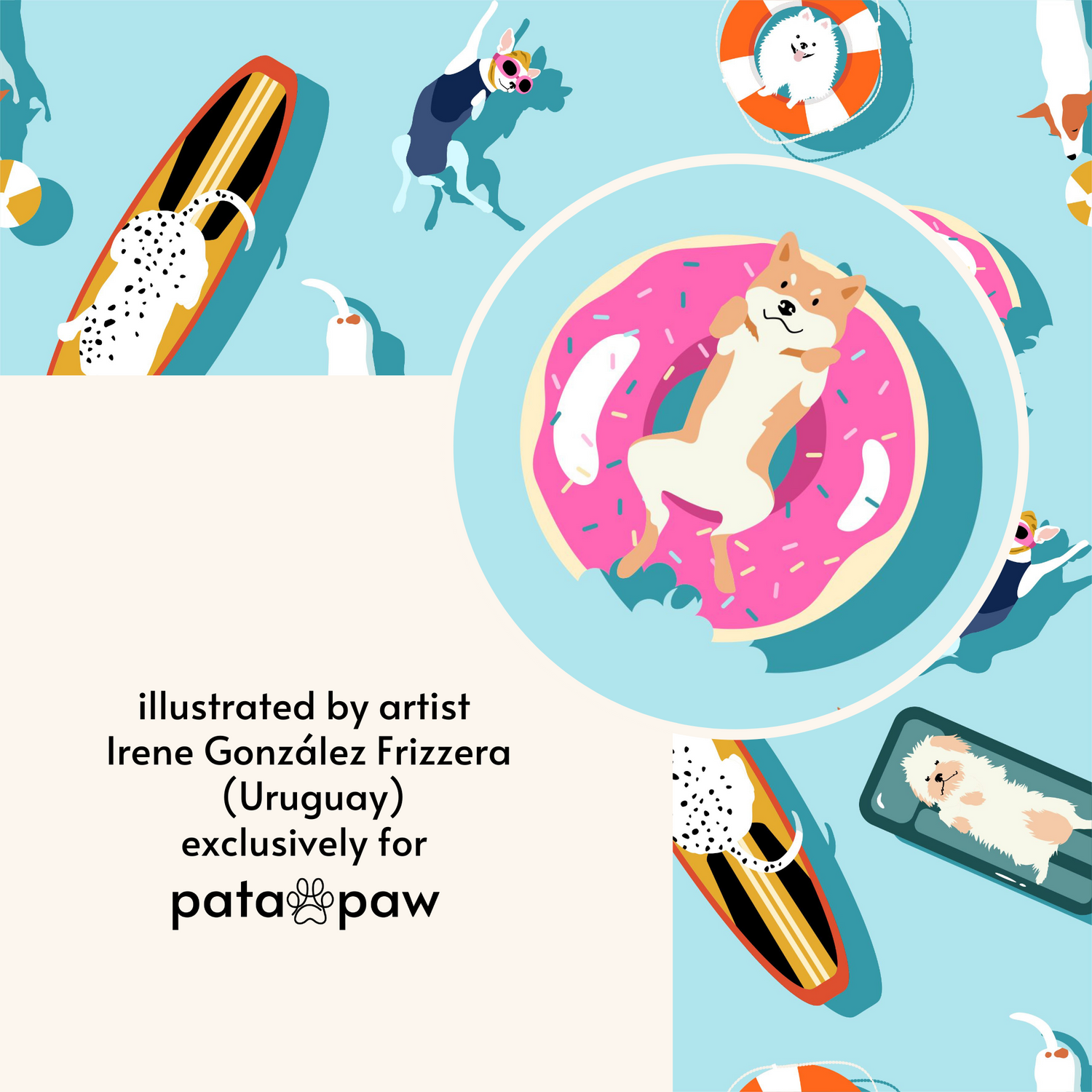 In our ideal summer, we dream only of pups! Illustrated by artist Irene González Frizzera (Uruguay) exclusively for Pata Paw. On the other side, a timeless and chic checkered pattern in aqua blue.