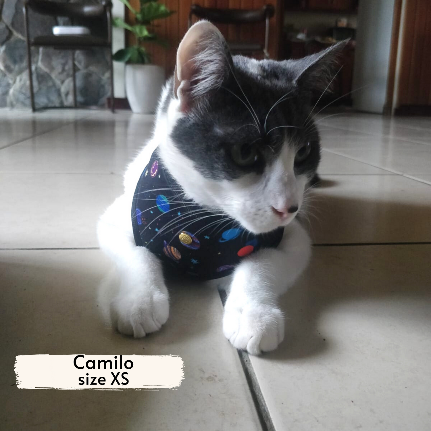 • Pata Paw space explorer harness as seen in a medium-sized dog. Reverse design showing a starry night.