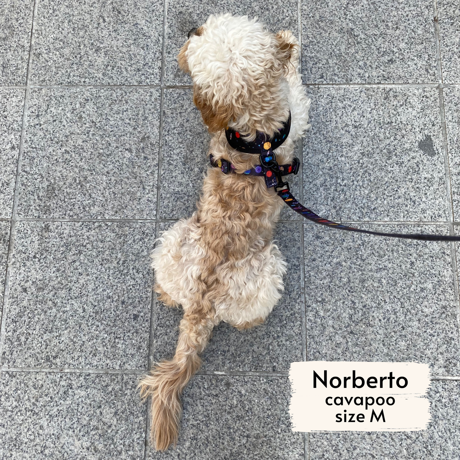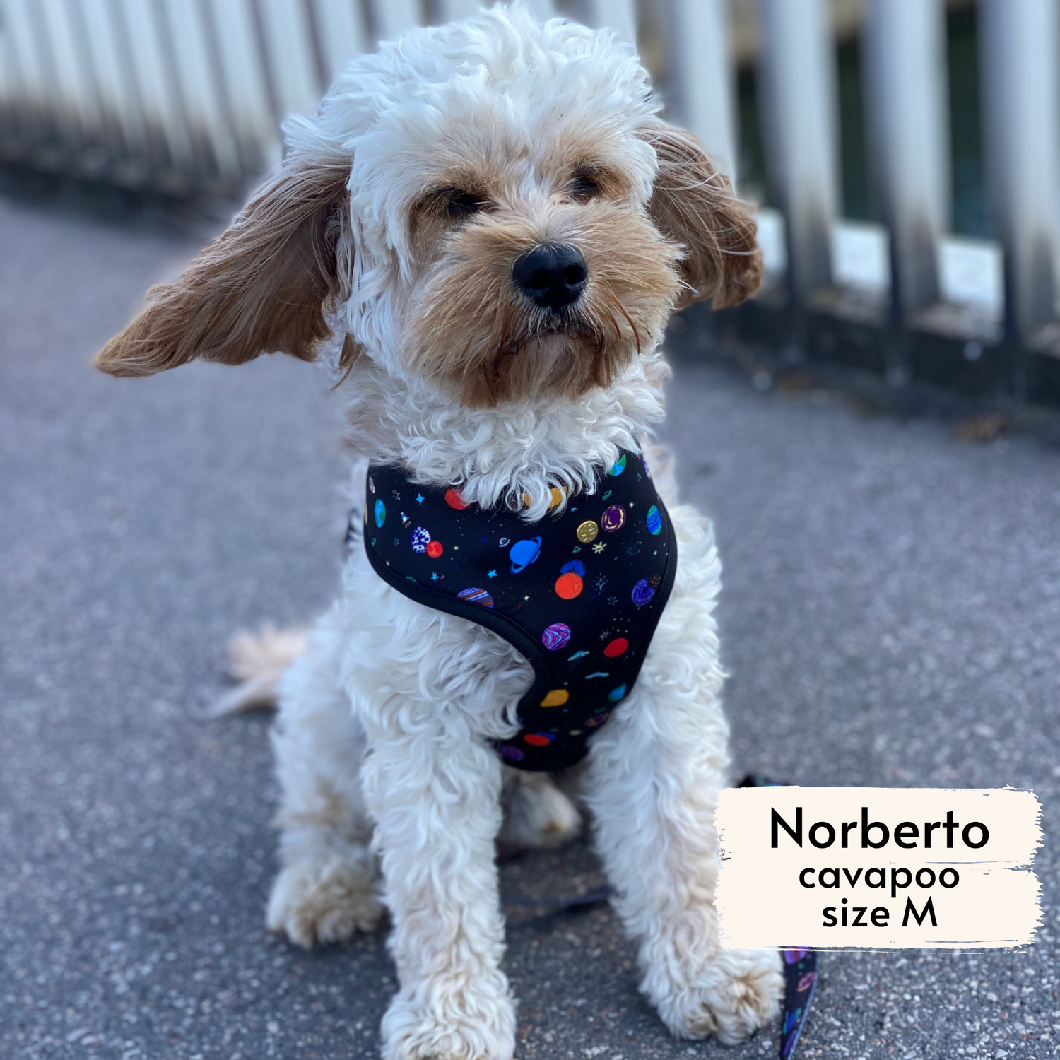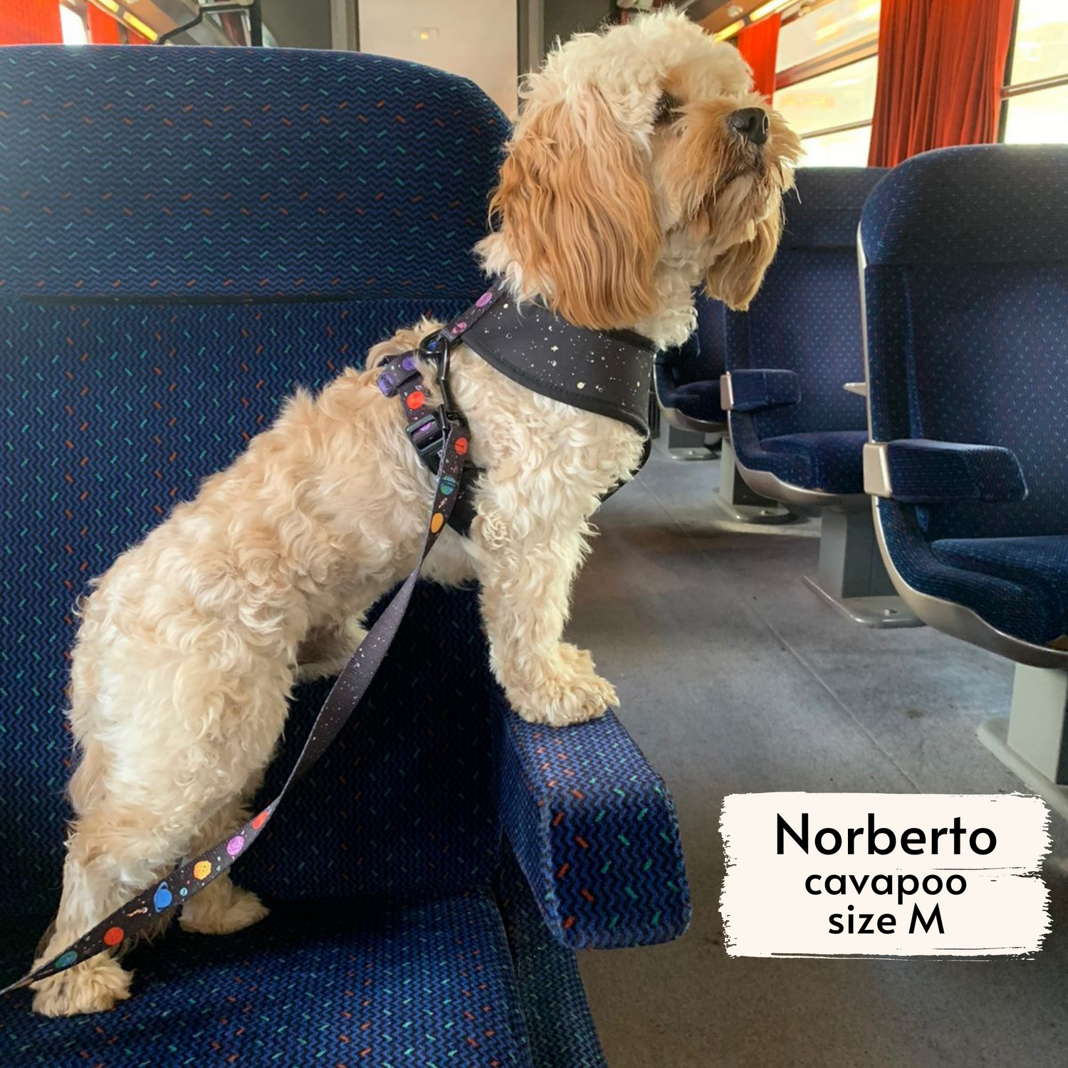 • pata paw space explorer harness and leash as seen on a medium dog, Norberto, a cavapoo