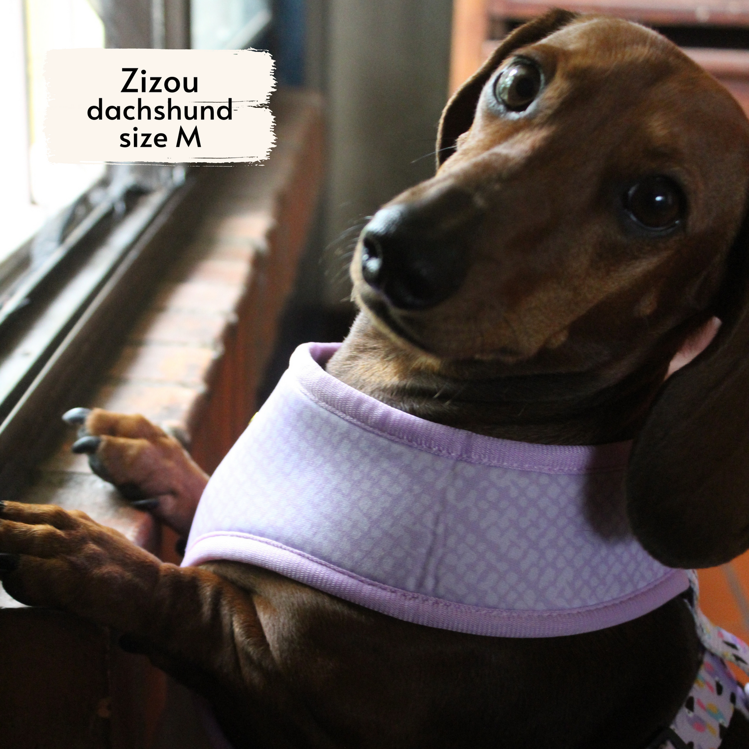 • Pata Paw toucan tropics harness as seen in a medium-sized dog. Reverse design showing a timeless and chic texture pattern in lilac.