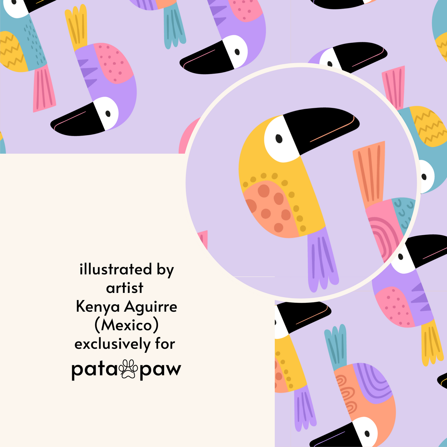 Cheerful colors evoking the energy of the tropics, illustrated by artist Kenya Aguirre (Mexico) exclusively for Pata Paw. On the other side, a timeless and chic texture pattern in lilac.
